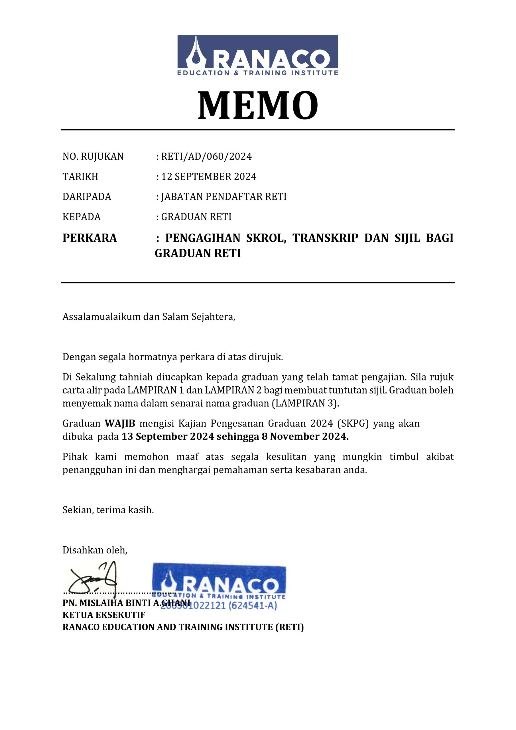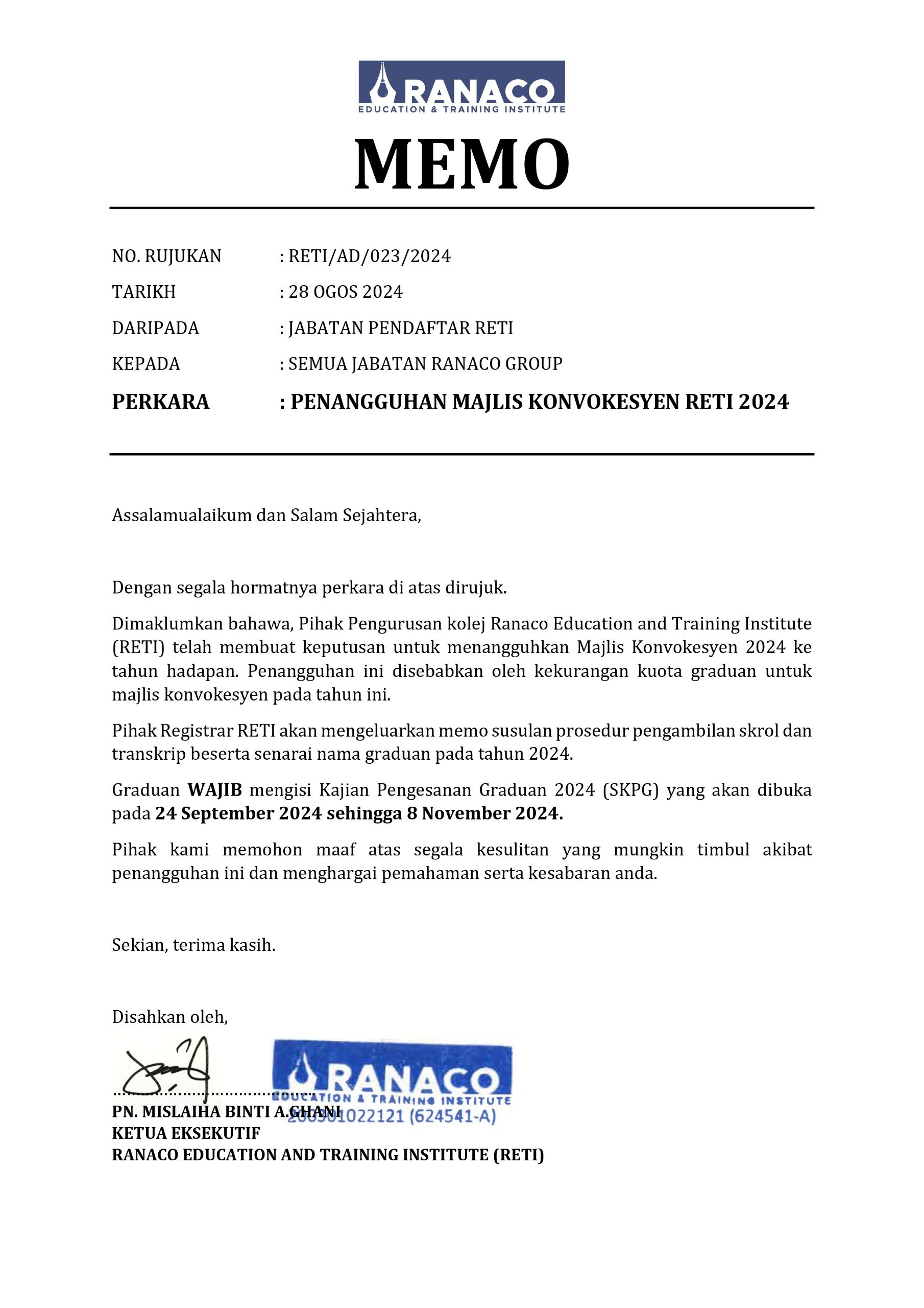 Announcement PENANGGUHAN MAJLIS KONVOKESYEN RETI 2024 | AGIHAN SKROL, TRANSKRIP DAN SIJIL BAGI GRADUAN RETI admin 14/10/2024 0 comments 812 Views 0 Likes Share: